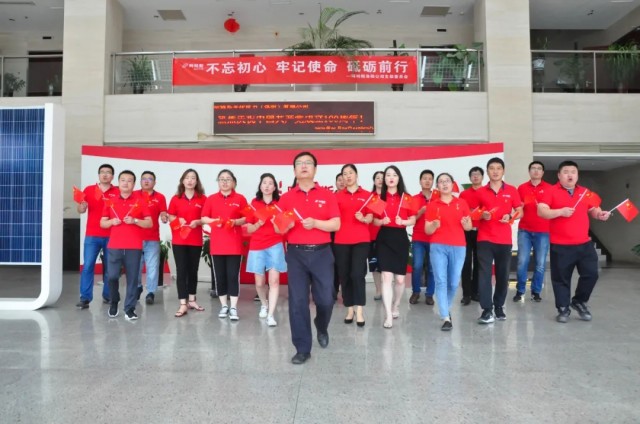 聽到熟悉的樂曲響起,阿特斯光伏電力(洛陽)有限公司的黨員們從各個(gè)辦公室走出,隨著節(jié)拍舞動(dòng)手中的小國旗,帶著滿腔的熱忱、昂揚(yáng)的斗志,高聲唱起“他指給了人民解放的道路,他引導(dǎo)中國走向光明......”